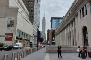 Zanim doszliśmy do dworca Grand Central, mieliśmy już oboje obolałe szyje od prób oglądania wszystkiego. Wreszcie znaleźliśmy otwartą kafejkę, usiedliśmy sobie z naszymi kanapkami i kawą i zaczęliśmy przyglądać się lokalsom wstępującym tu po śniadanie w drodze do pracy. Zaglądał tu pełen przekrój społeczny, widać też było, że większość to stali bywalcy, często nawet nie musieli mówić uwijającym się jak w ukropie pracownikom kafejki, co zamawiają. Panowie w drogich garniturach, panie w garsonkach i sportowych butach, robotnicy, starsze panie w spodniach dresowych i t-shirtach, starsi panowie czytający gazetę nad kawą i bajglem. Rzadko rozmawiający, z poważnymi minami, bez uśmiechu, taki poranny obraz nowojorczyków nam się objawił.