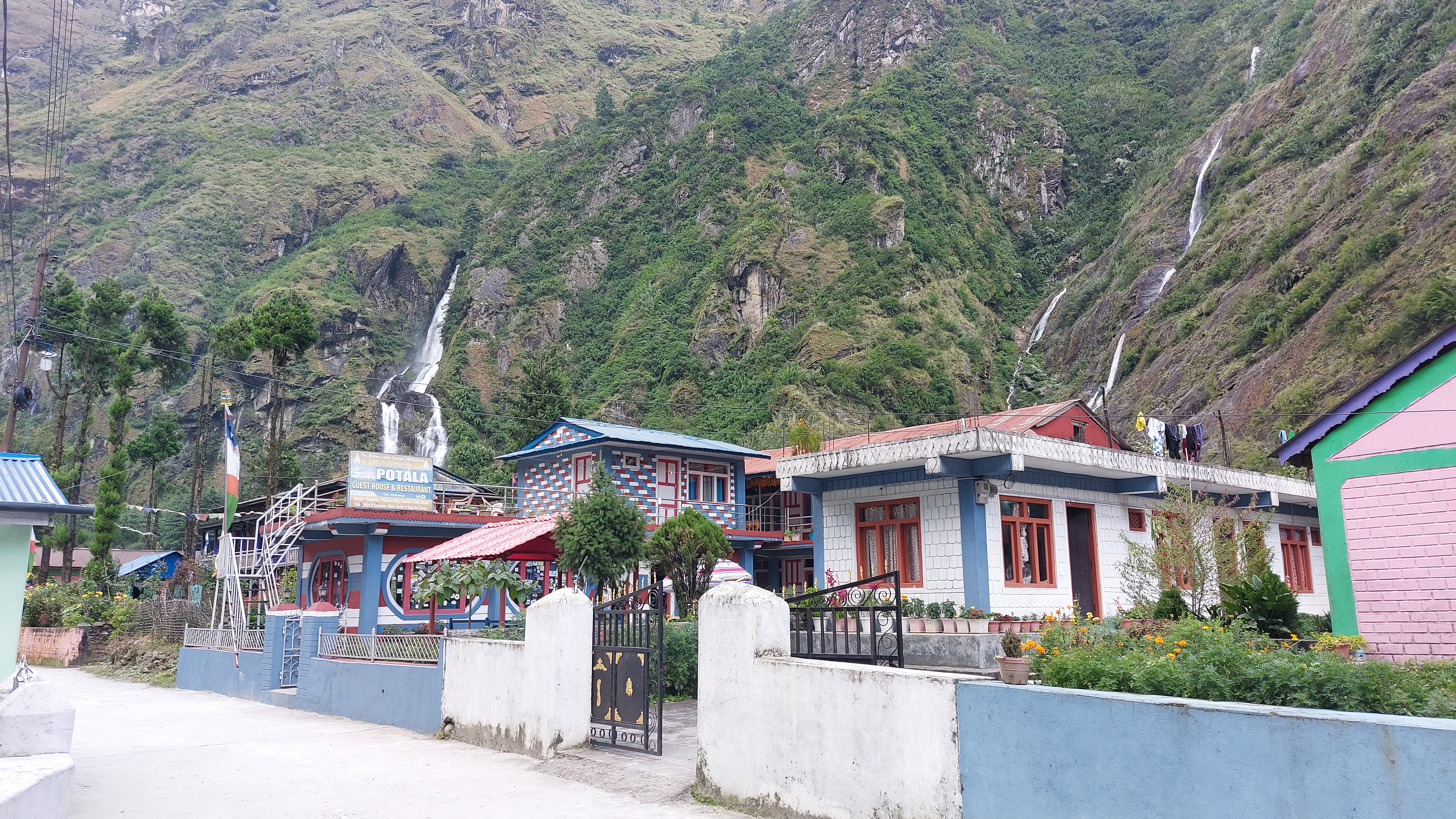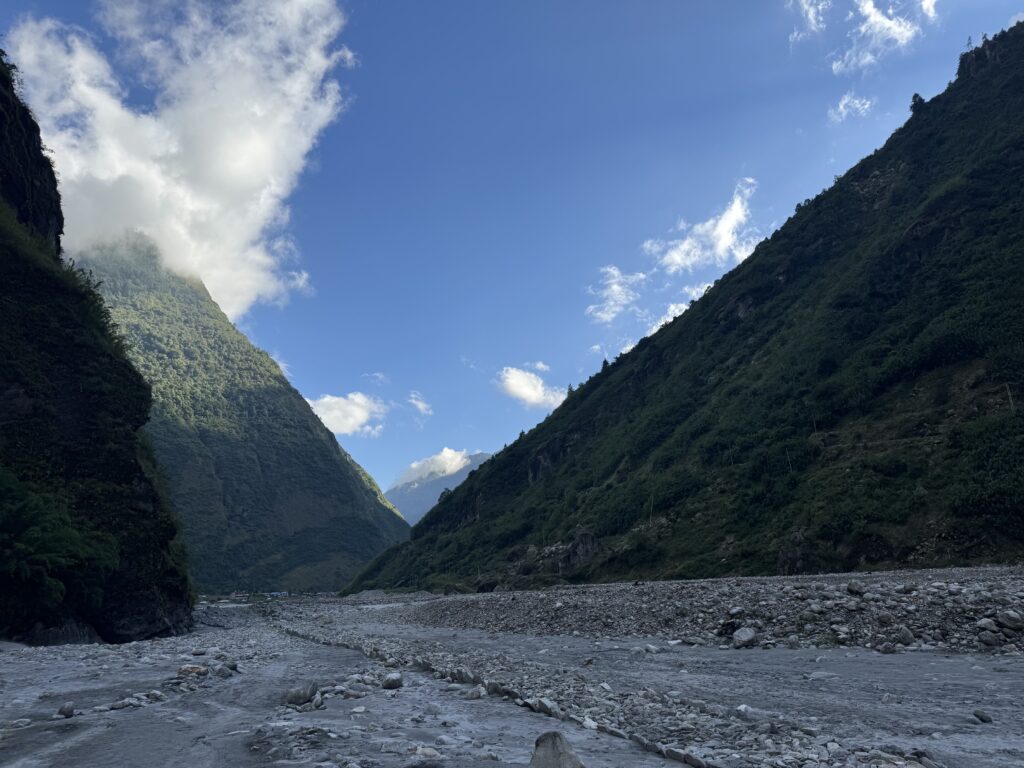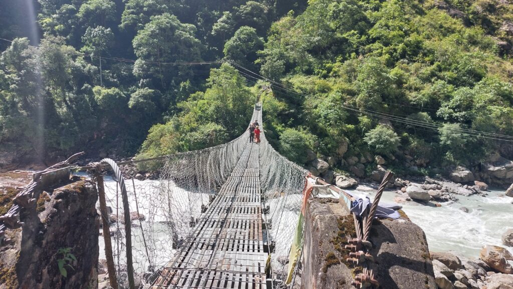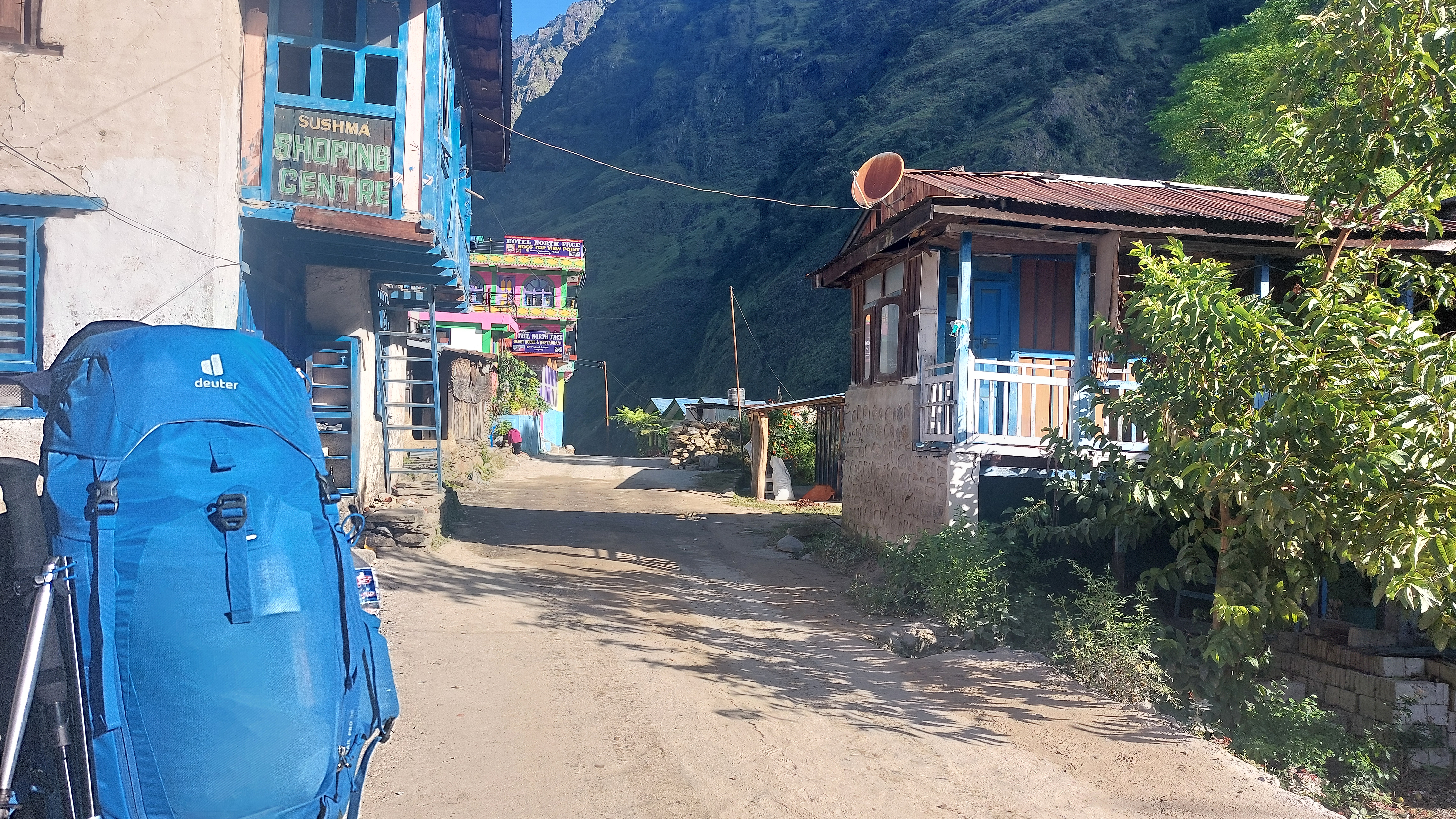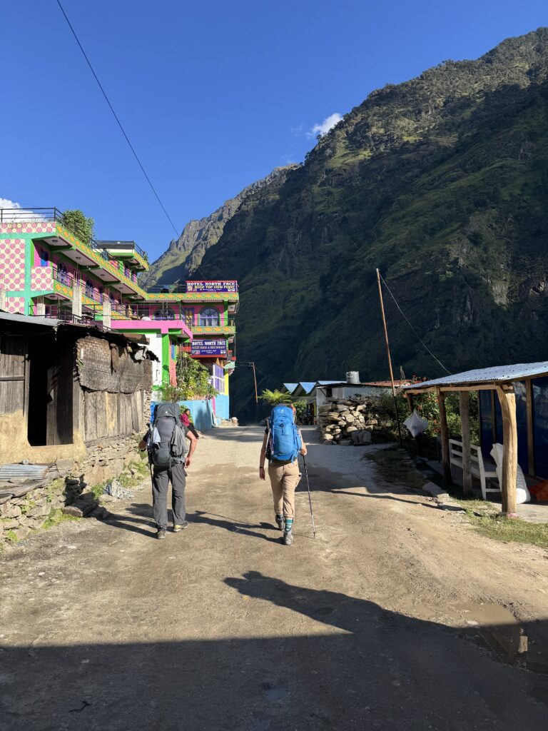 Obudziło nas znowu słońce, i pobiegliśmy na śniadanie, jako że poprzedniego dnia umówiliśmy się z właścicielem hotelu, że będzie gotowe na 7:30, żebyśmy mogliśmy szybko wystartować na trasę. Takie umawianie się poprzedniego dnia co do godziny posiłków świetnie się sprawdzało, przy czym musicie wiedzieć, że w teahouse’ach często działa zasada, że jeżeli zostajecie na noc i decydujecie się w tym samym miejscu zjeść obiad i śniadanie, to albo nie płacicie nic za nocleg, albo macie wtedy solidną zniżkę. A nie ma sensu szukać w innych teahouse’ach tańszych opcji, bo menu jest zatwierdzane przez lokalne władze i we wszystkich hotelikach ceny będą identyczne. Dodatkowo, jeżeli idzie z Wami tragarz, to mimo, że oficjalnie Bijay’a płacił za siebie sam, my za jego nocleg i wyżywienie też często dostawaliśmy zniżkę. A że Bijay’a wszędzie miał przyjaciół, to szybko oddaliśmy w jego ręce kwestie uzgadniania ceny i zaklepywania nam noclegów. Przez zupełny przypadek zyskaliśmy osobę, która była dla nas przewodnikiem i to takim, który nie tylko wskazywał trasę ale i dzielił się informacjami o tym, jak żyje się w Nepalu, która zdjęła z nas obowiązki organizowania sobie trasy, i która okazała się niesamowicie przyjacielska, uczynna i pomocna. Dość powiedzieć, że cały czas, mimo dzielących nas kilometrów utrzymujemy ze sobą kontakt.