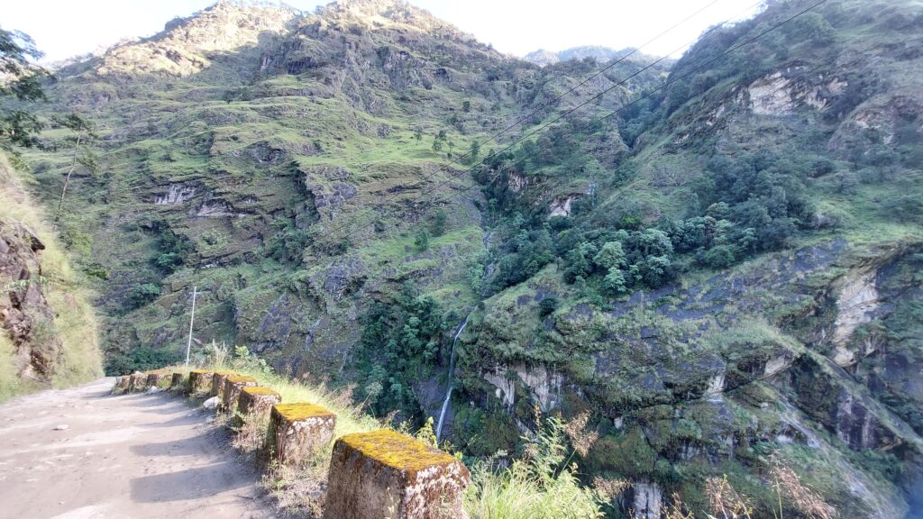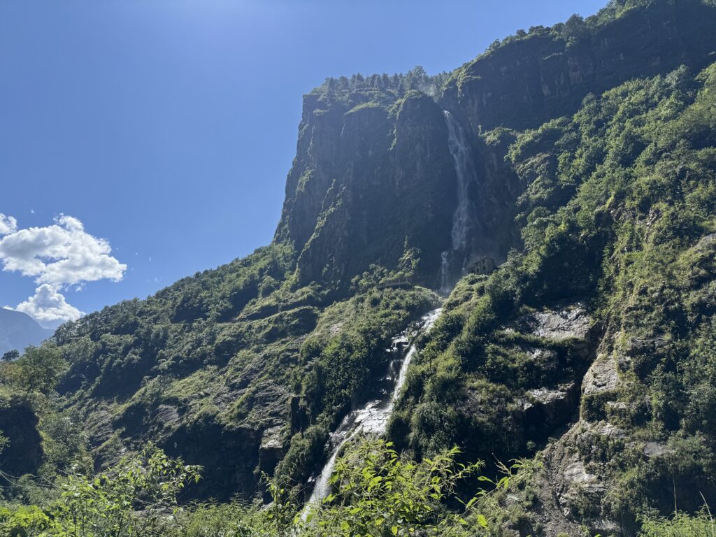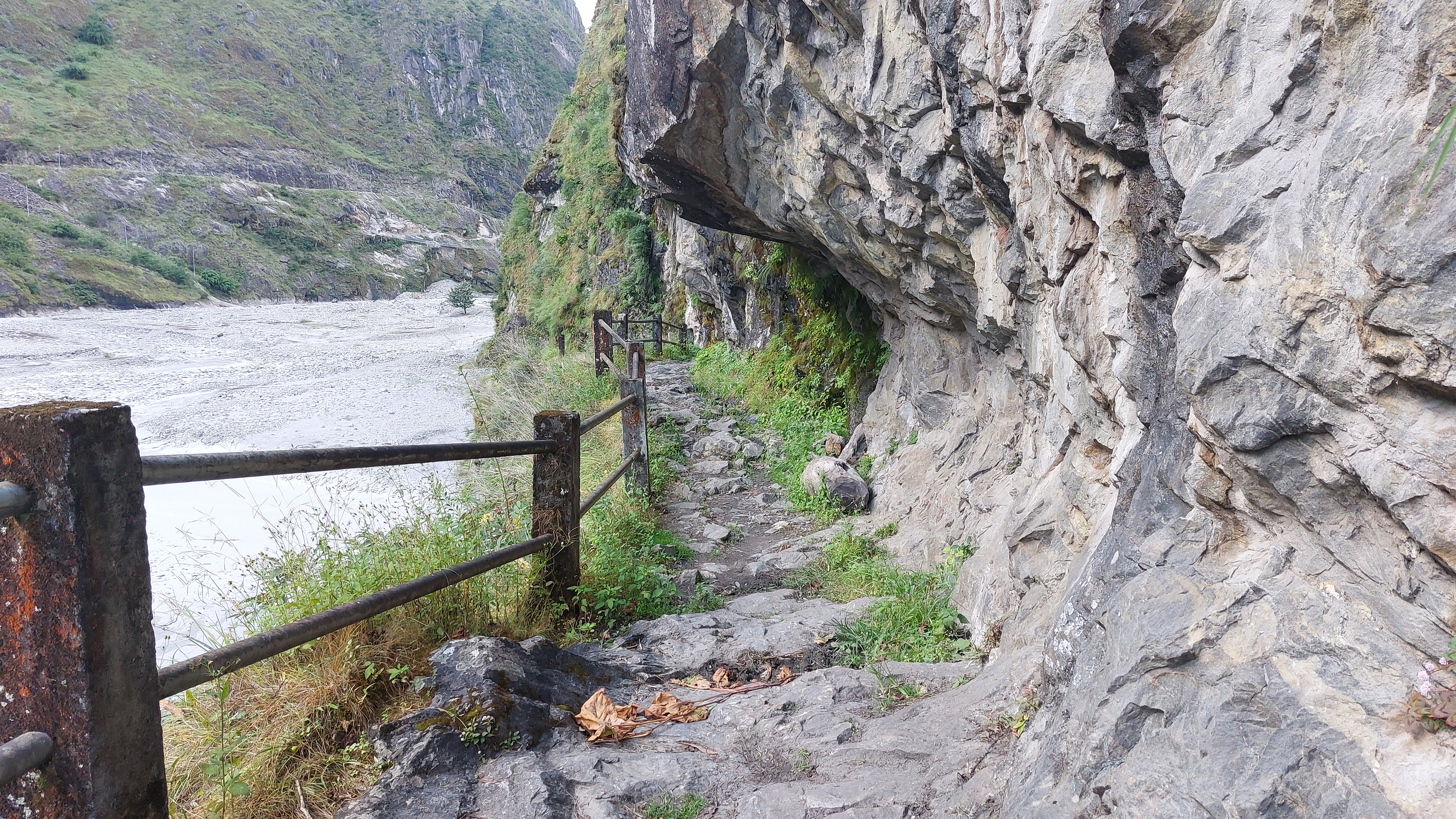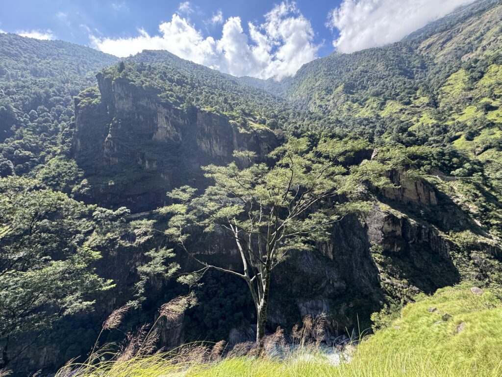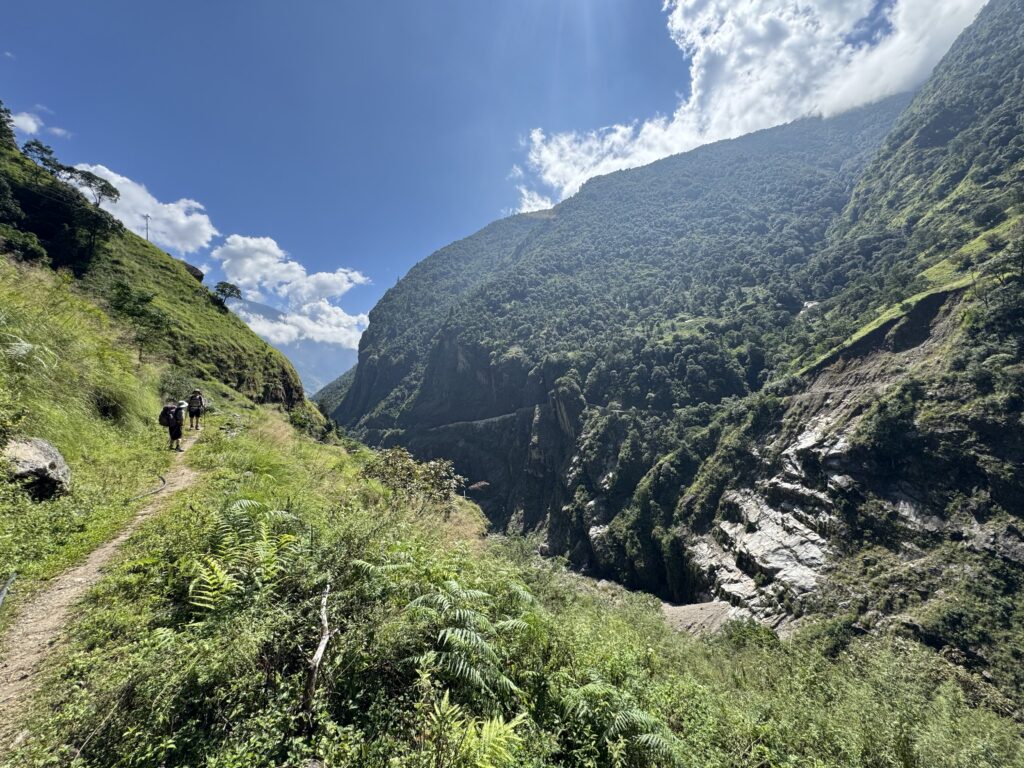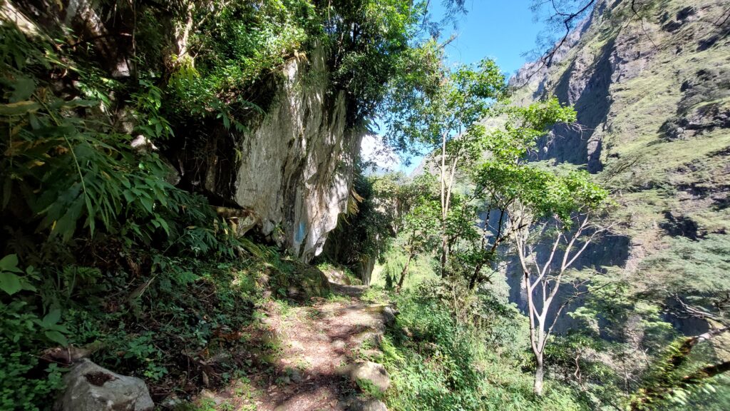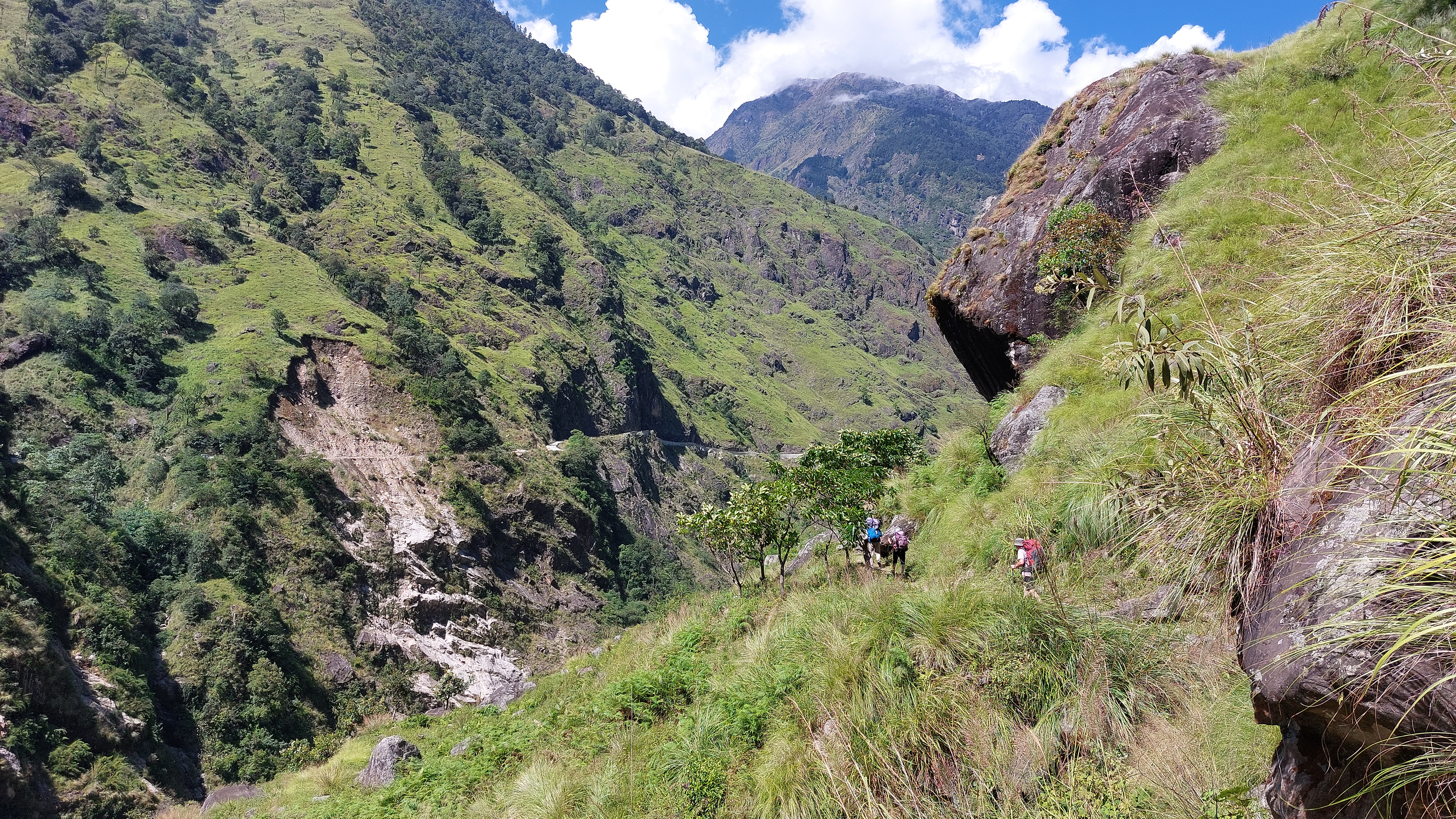 Najpierw nasza trasa prowadziła w dół, żeby standardowo za chwilę odbić ostro w górę. To urok szlaku NATT, który jest dużo dłuższy i trudniejszy niż chodzenie drogą, ale wart jest każdej kropli potu i każdego wysiłku. Są chwile, kiedy drogi te się łączą, ale najpiękniejsze odcinki, to właśnie te, gdzie albo idzie się drogami wyglądającymi jak ścieżki wydeptane przez zwierzęta, albo gdzie brnie się przez strumienie, skacze po pniach udających mostki, przemyka pod wiszącymi skałami, albo wspina po starych kamiennych schodach wzdłuż których płynie wodospad.