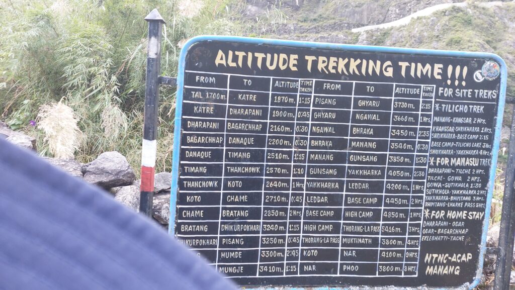 Kawałeczek dalej natknęliśmy się na tablicę, która jest wyjątkowo przydatna na ACT. Na trekkingu w Himalajach z wysokością trzeba bardzo uważać, generalna zasada jest taka, że począwszy od przekroczenia pułapu 2 500 m npm, trzeba tak planować noclegi, żeby spać nie wyżej niż 500 m od poprzedniego noclegu, przy czym zaleca się zrobić sobie spacer na wyższą wysokość, pobyć tam trochę, i wrócić na nocleg niżej, żeby organizm miał czas się dostosować. I tego trzeba się trzymać, bo ilość hojraków, którym się wydawało, że to bzdury dla mięczaków, a zostali zwiezieni helikopterem w stanie krytycznym albo jeszcze gorszym, jest w każdym sezonie niewiarygodna. My wszyscy sztywnieliśmy, ile razy widzieliśmy helikopter lecący z Manang, gdzie jest punkt medyczny i ewakuacyjny, a nie było dnia żebyśmy nie widzieli jak leci. Trzeba też bardzo dużo pić, zwłaszcza rano, i regularnie jeść. My doliczyliśmy się, że średnio piliśmy co najmniej 7 litrów płynów. Dlatego bardzo przydatne na trasie są termosy, butelki, filtr i przystanki w teahouse’ach na herbatki.