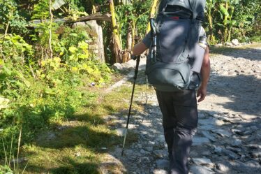 Najpierw nasza trasa prowadziła w dół, żeby standardowo za chwilę odbić ostro w górę. To urok szlaku NATT, który jest dużo dłuższy i trudniejszy niż chodzenie drogą, ale wart jest każdej kropli potu i każdego wysiłku. Są chwile, kiedy drogi te się łączą, ale najpiękniejsze odcinki, to właśnie te, gdzie albo idzie się drogami wyglądającymi jak ścieżki wydeptane przez zwierzęta, albo gdzie brnie się przez strumienie, skacze po pniach udających mostki, przemyka pod wiszącymi skałami, albo wspina po starych kamiennych schodach wzdłuż których płynie wodospad.